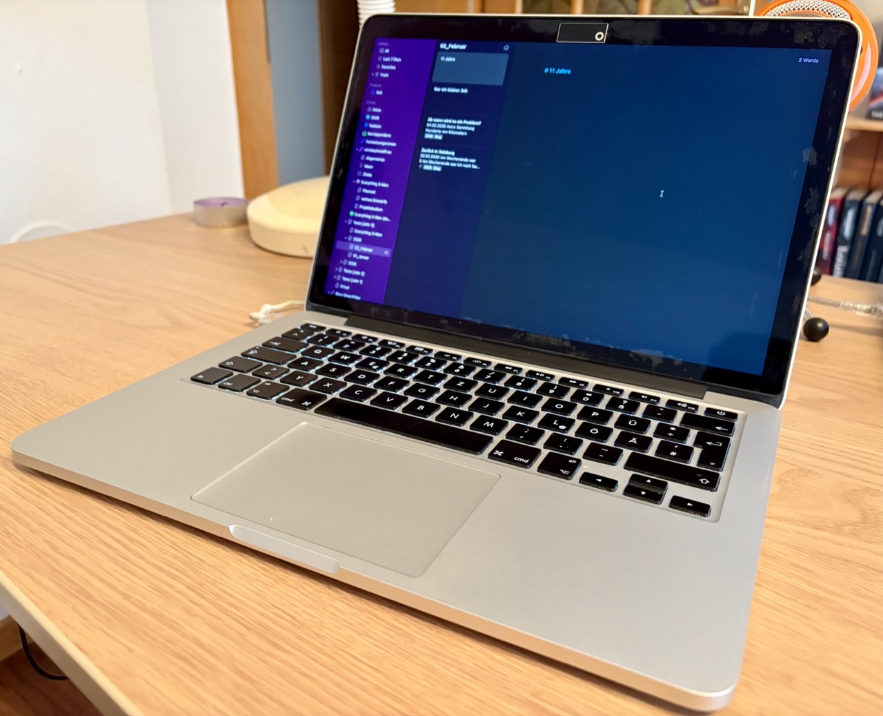 Etwas, das mich ebenfalls beschäftigt hat, war mein altes MacBook. Vor etwa eineinhalb Jahren habe ich auf ein neues MacBook-Pro-Modell upgegradet und es noch keine Minute bereut Es funktioniert einfach. Doch das alte funktioniert auch noch, dachte ich mir, und ich habe es reaktiviert. Der Gedanke dahinter war, dass ich das neue MacBook nicht dauernd hin- und hertragen muss (das Büro/der Hobbyraum befindet sich einen Stock unter meiner Wohnung). So habe ich im Büro stets Zugriff auf meine Schreibsoftware (Ulysses) und kann spontane Ideen festhalten. Das alte MacBook hat immerhin schon 11 Jahre auf dem Buckel und wurde seit Monaten nicht aufgeklappt. Wie würde es sich wohl nach so langer Zeit anfühlen?