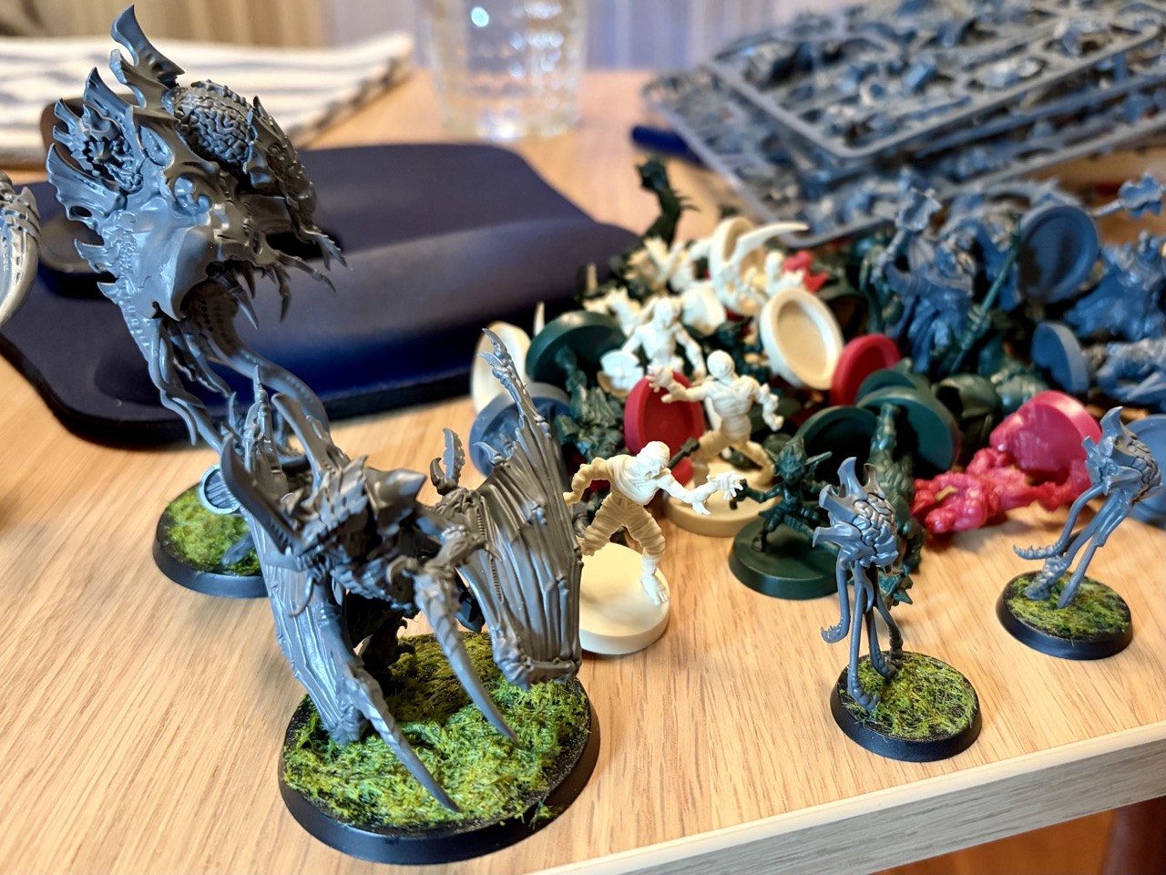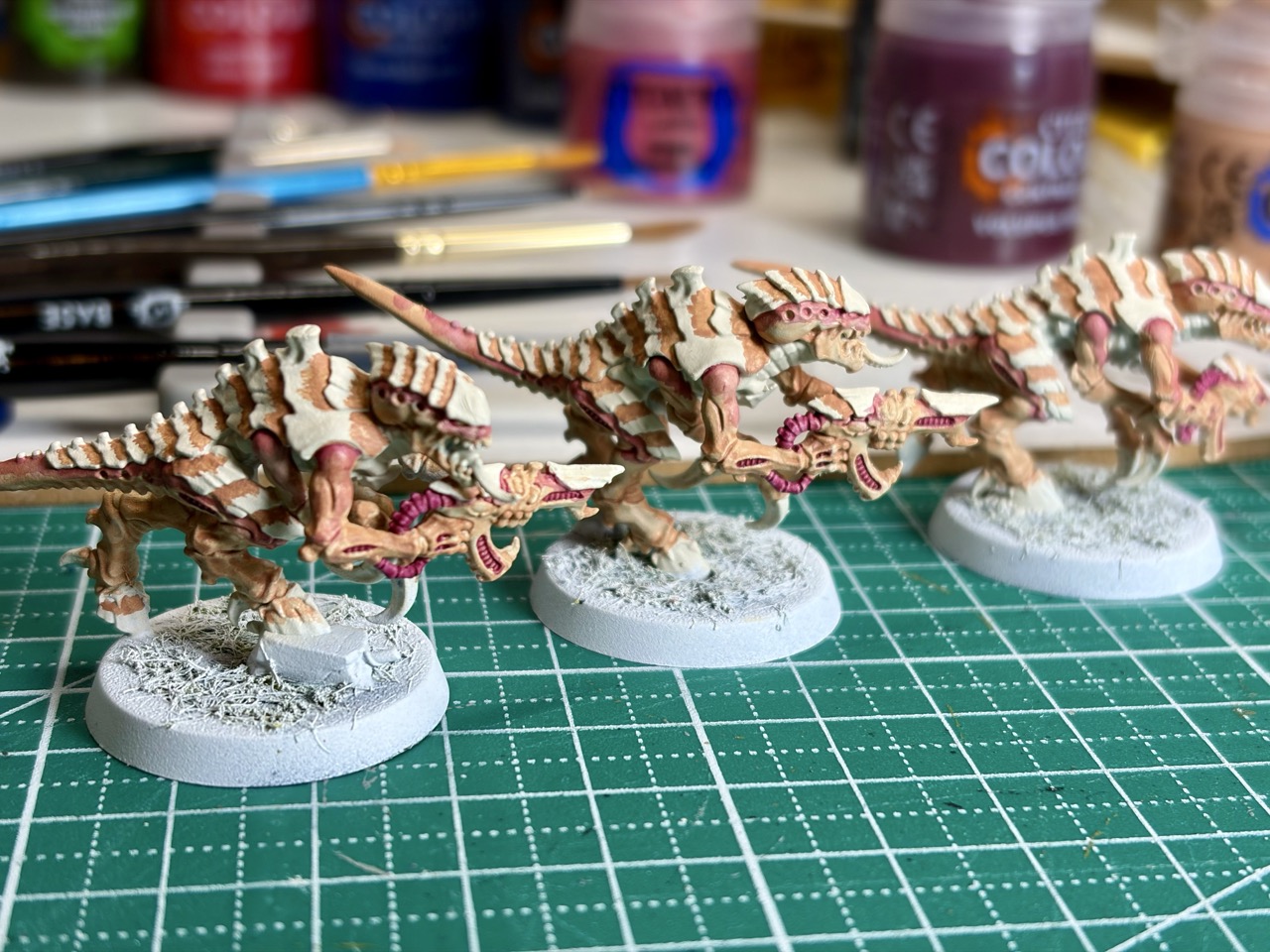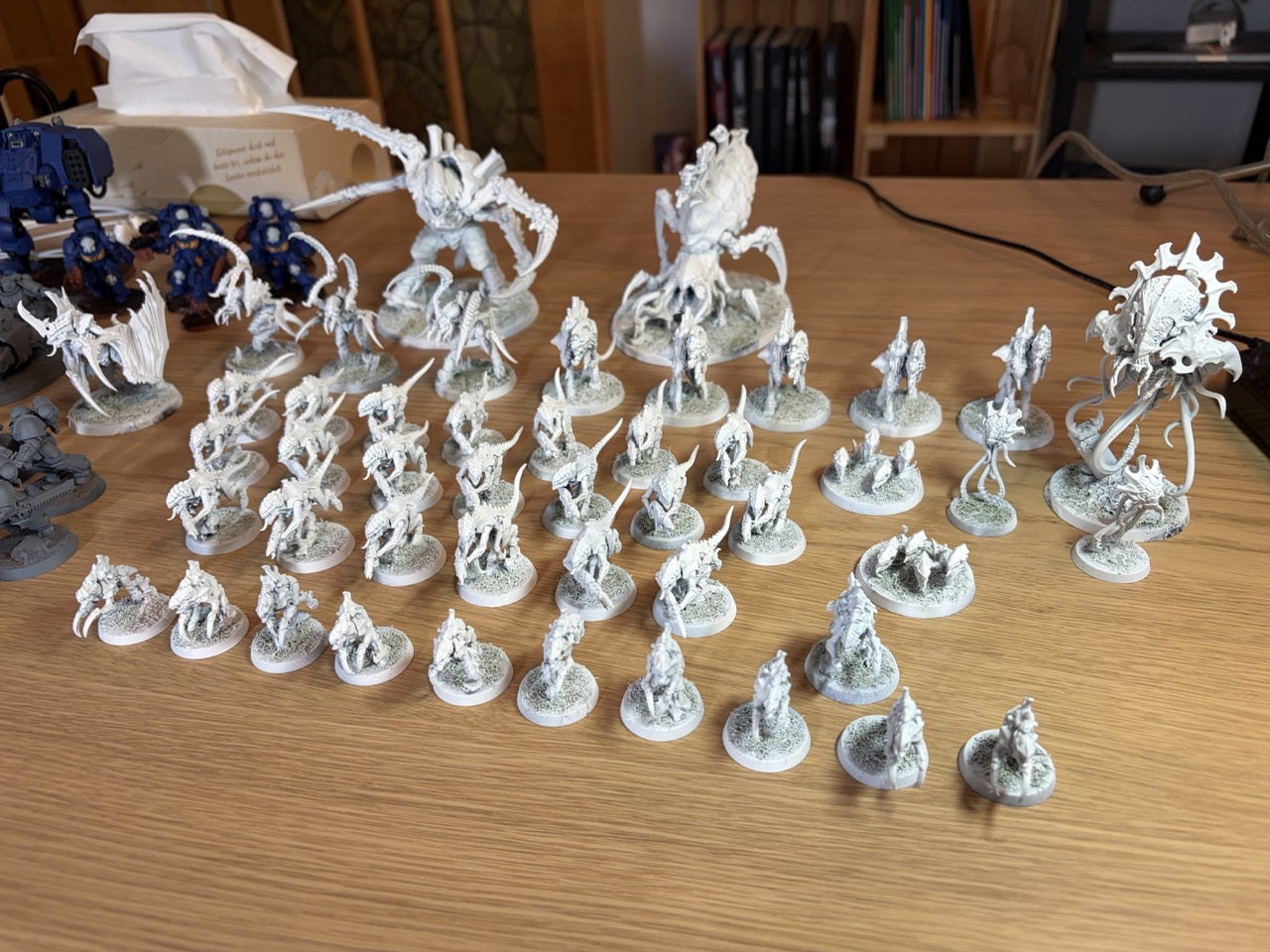 Die Miniaturen der Tyraniden sind toll designt. Ihnen haftet ein alienartiger Horror an, der mir sehr zusagt. Außerdem kann man sie in allen möglichen Farbschemata bemalen. Das ist etwas, was mir aktuell noch am meisten Kopfzerbrechen bereitet. Denn eigentlich sollte ein Schwarm in einem einheitlichen Design daherkommen. Ich werde allerdings meinen eigenen Weg gehen und alle anders bemalen. Etwas, das mir allerdings wichtig ist, sind die Grundplatten. Diese gestalte ich einheitlich, sodass zumindest daran erkennbar ist, dass es sich um einen Schwarm handelt. Allerdings hat auch das Farbschema der Tyraniden selbst ein gewisses Konzept – zumindest habe ich eines im Kopf. Mein prinzipieller Gedanke ist, dass die Kleinen sehr hell, fast schon albino-mäßig, aussehen sollen. Je größer sie sind, desto dunkler werden sie. Spezielle Einheiten bekommen aber Farbeinsprengsel. Es wird also doch irgendwie eine bunte Mischung. Ob das am Ende nach einem gewollten Konzept aussieht, wird sich zeigen.