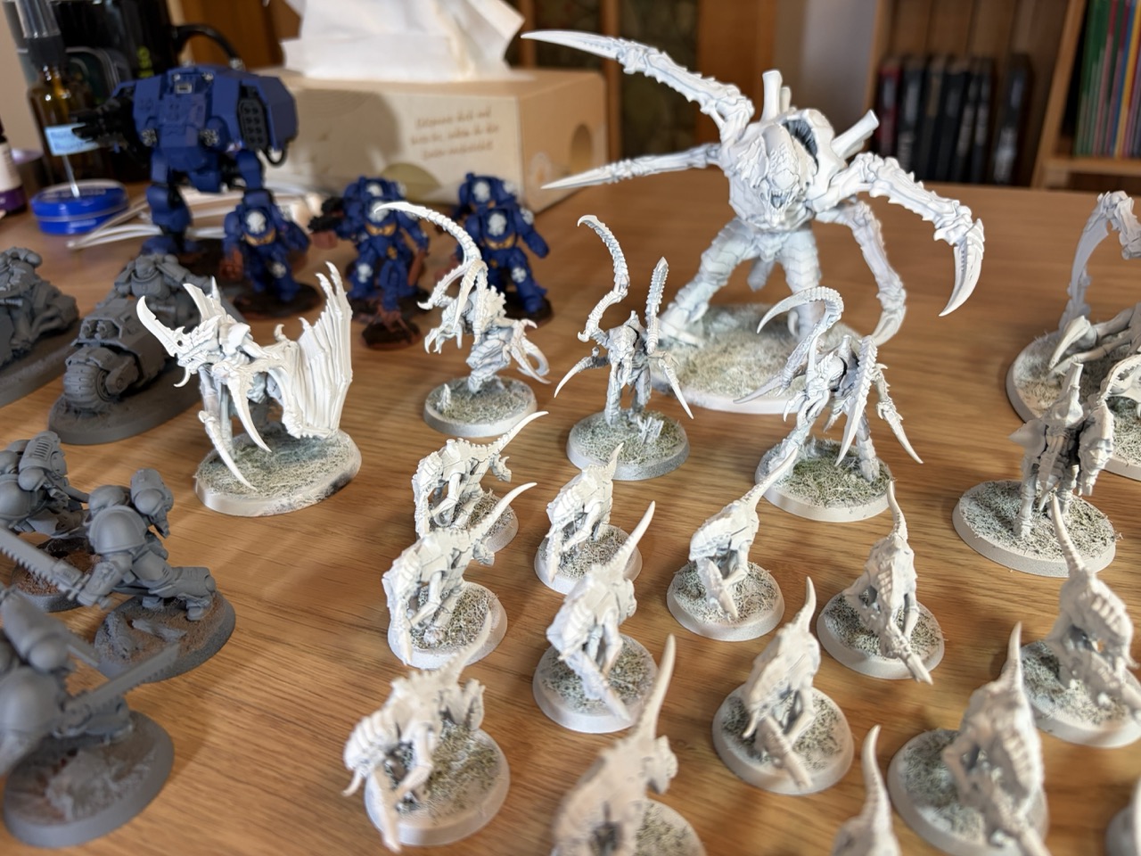 Meine Überlegungen führten mich immer wieder zu Chaos und vor allem zu den Chaosdämonen. Das sind beeindruckende Miniaturen mit einer ordentlichen Schlagkraft. Hier müsste ich allerdings von vorne anfangen. In der Box der 10. Edition von vor drei Jahren waren allerdings Tyraniden enthalten. Eigentlich hat mir diese Xenos-Fraktion nie wirklich zugesagt und hat mich auch nie wirklich interessiert. Aber im Zuge der Frage „Was habe ich eigentlich alles?“ habe ich sämtliche Miniaturen zusammengebaut. Fast eine Woche lang habe ich sämtliche Space Marines aus allen Packungen, die ich noch hatte, zusammengebaut und bin dann zu den Tyraniden übergegangen. Ich bin noch nicht ganz durch, beim Schreiben dieser Zeilen, aber fast. Es ist mehr zusammengekommen, als ich mir gedacht habe. Und was soll ich sagen – Tyraniden sehen schon geil aus.