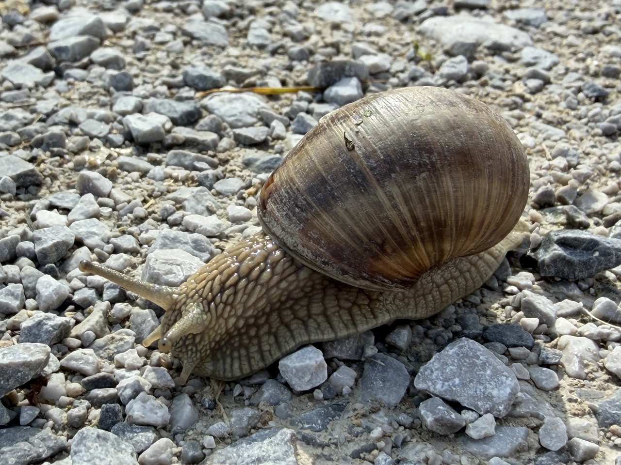 Natürlich sind mir wieder die typischen Menschen untergekommen, die es nicht schaffen, ihre Hunde anzuleinen und die auch nicht wirklich so aussehen, als hätten sie ihre Viecher unter Kontrolle, wenn es darauf ankäme, aber darüber möchte ich mich heute nicht aufregen. Ich ging gedankenverloren und dem Podcast lauschend genüsslich über den Schotterweg in der Au, da erblickte ich eine Schnecke am Boden. Ich hielt sofort inne, da ich fast draufgetreten war. Erst machte ich noch ein paar Schritte, kehrte schließlich aber doch um, um ein hübsches Bild von der Schnecke zu machen, die sich gerade ihren Weg über die Steine bahnte.