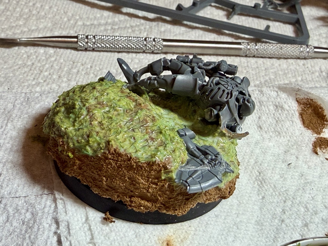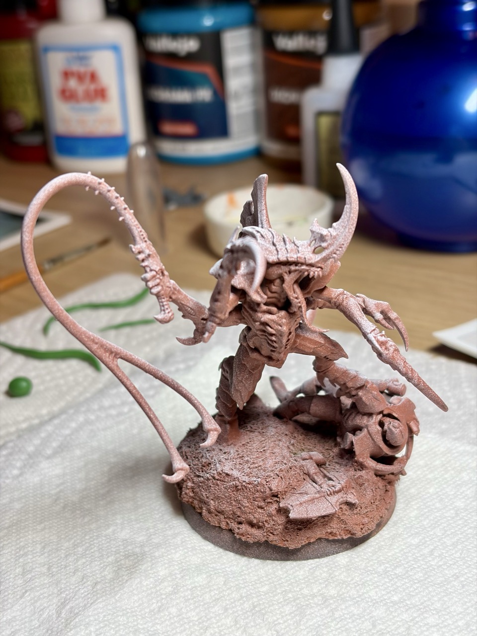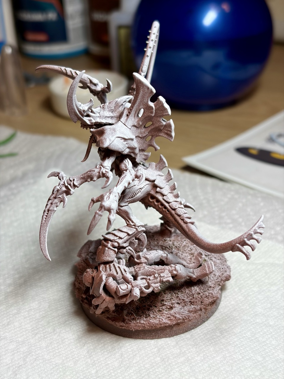 Oder Kitbashing. Hier handelt es sich um das neue Kombinieren, Modellieren und/oder Modifizieren vorhandener (Warhammer-)Figuren. Es ist zwar nett, die Figuren so zusammenzubauen, wie es in der Anleitung steht, und es funktioniert die meiste Zeit auch sehr gut. Jedoch sind eigene Abwandlungen immer wieder reizvoll. So verleiht man den Figuren einen persönlichen Touch. Sie werden wirklich zu meinen Figuren. Wie weit man dabei geht, ist natürlich jedem selbst überlassen. Ich habe letztens für den neuen Tyranid Prime eine eigene Base gemacht. Ich habe einfach Sachen versucht, einen Necron zusammengebaut und wieder strategisch zerlegt, sodass es nach einem Kampf aussah. Ob es am Ende funktioniert, wusste ich nicht. Mit dem Ergebnis bin ich dennoch zufrieden. Aber wenn ich es nicht versucht hätte, hätte ich gar nichts vorangebracht. Ich habe auch fürs nächste Mal etwas gelernt, werde andere Dinge und Zusammenstellungen versuchen. Modelle möchte ich ebenfalls abwandeln. Nicht jede Figur oder Base werde ich dermaßen personalisieren, aber es macht mir Freude.