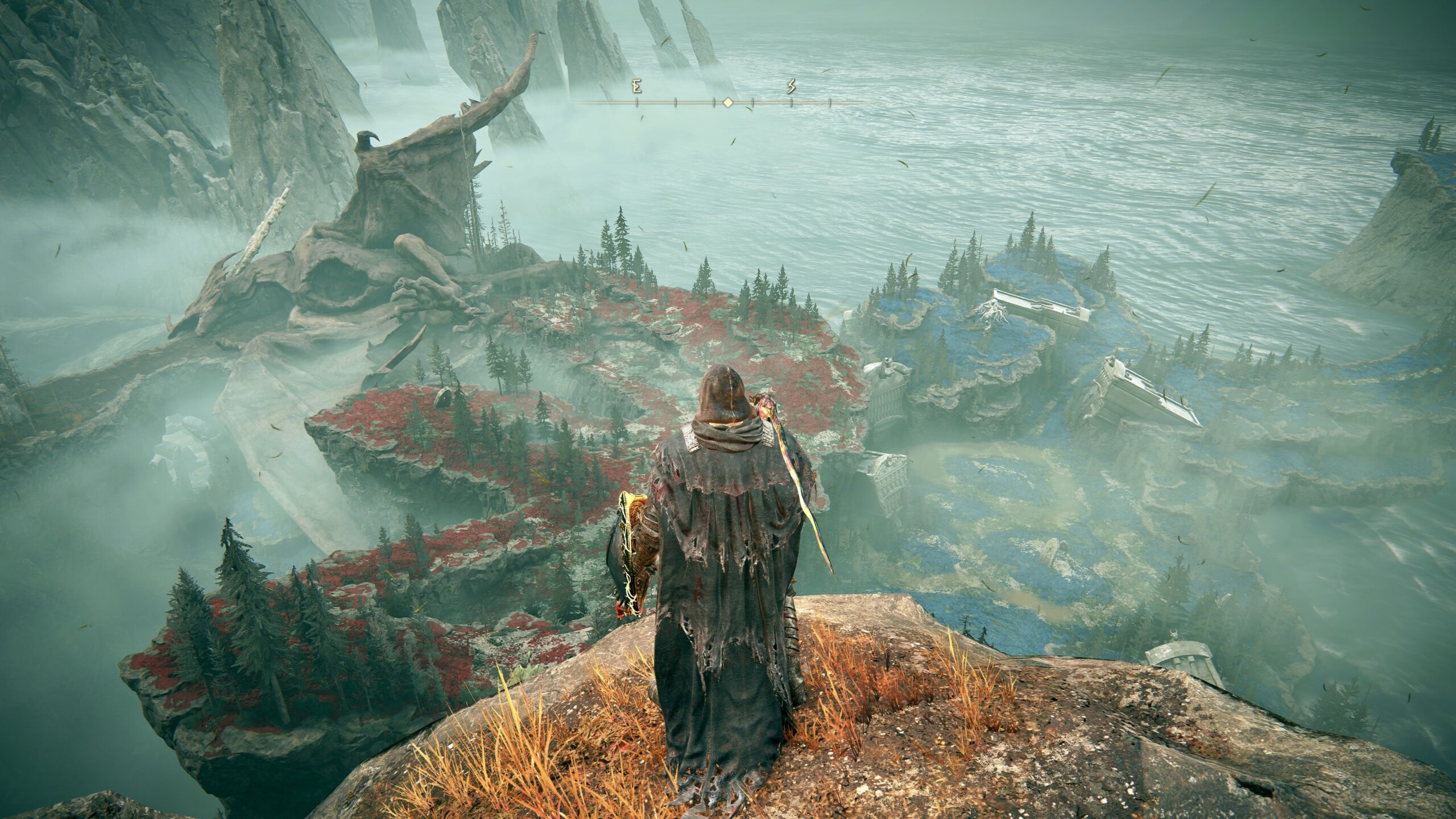 Alles soweit unspektakulär. Aber diese subtile Epik ist ebenfalls ein Markenzeichen dieses Spiels, das mich so sehr fesselt. Als Erstes wurde ich von einem fantastischen Ausblick überwältigt. Die Kulisse ist wie immer atemberaubend und ich kann es kaum erwarten, jeden einzelnen Winkel davon zu erkunden. Das „Startgebiet“, wenn man so will, hat mich gleich mal gefordert. Der zweite Gegner hat mich bereits das erste Mal getötet. Es war der Invader-artige Typ mit den Klauen, der mich mit seinem Schadens-Output überrascht hat. So wie jede Art von Gegnern bisher.