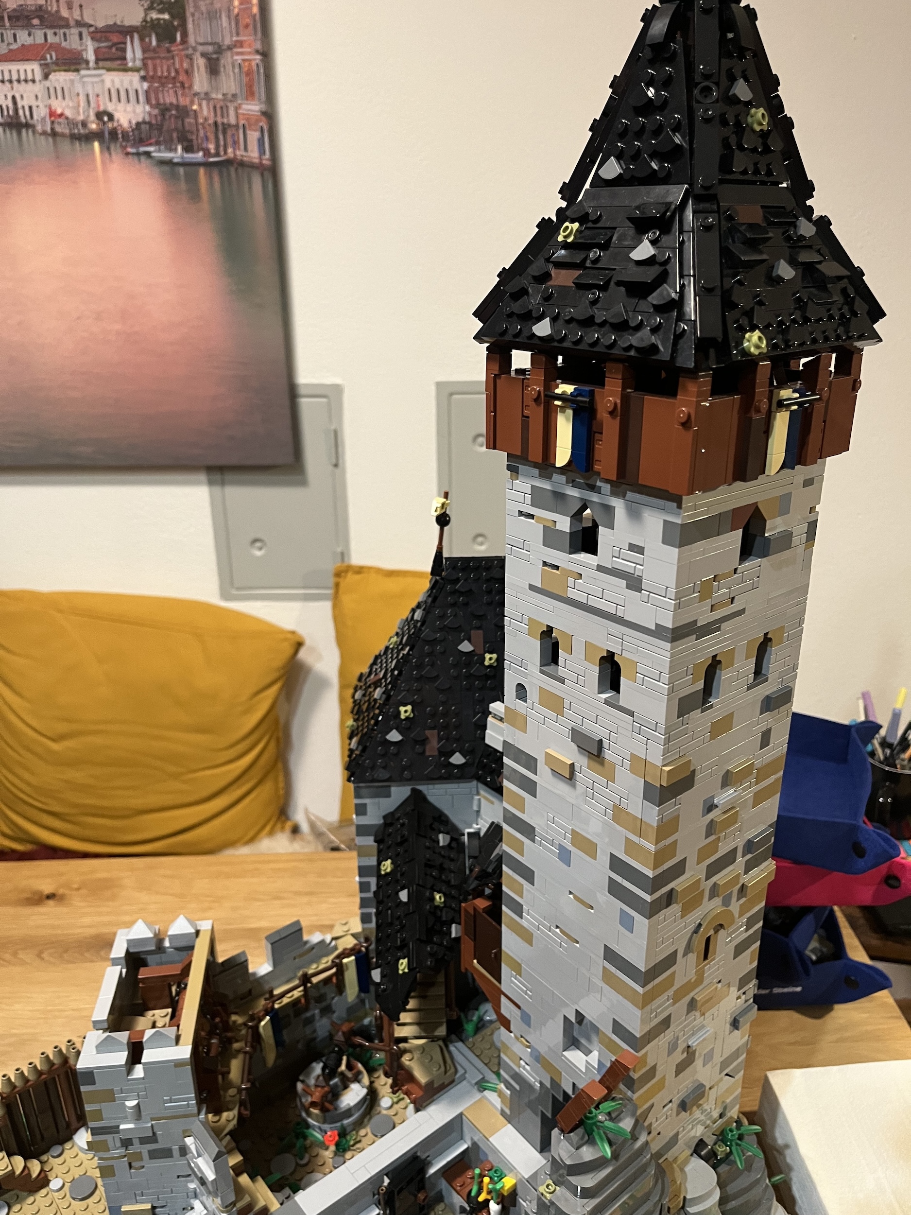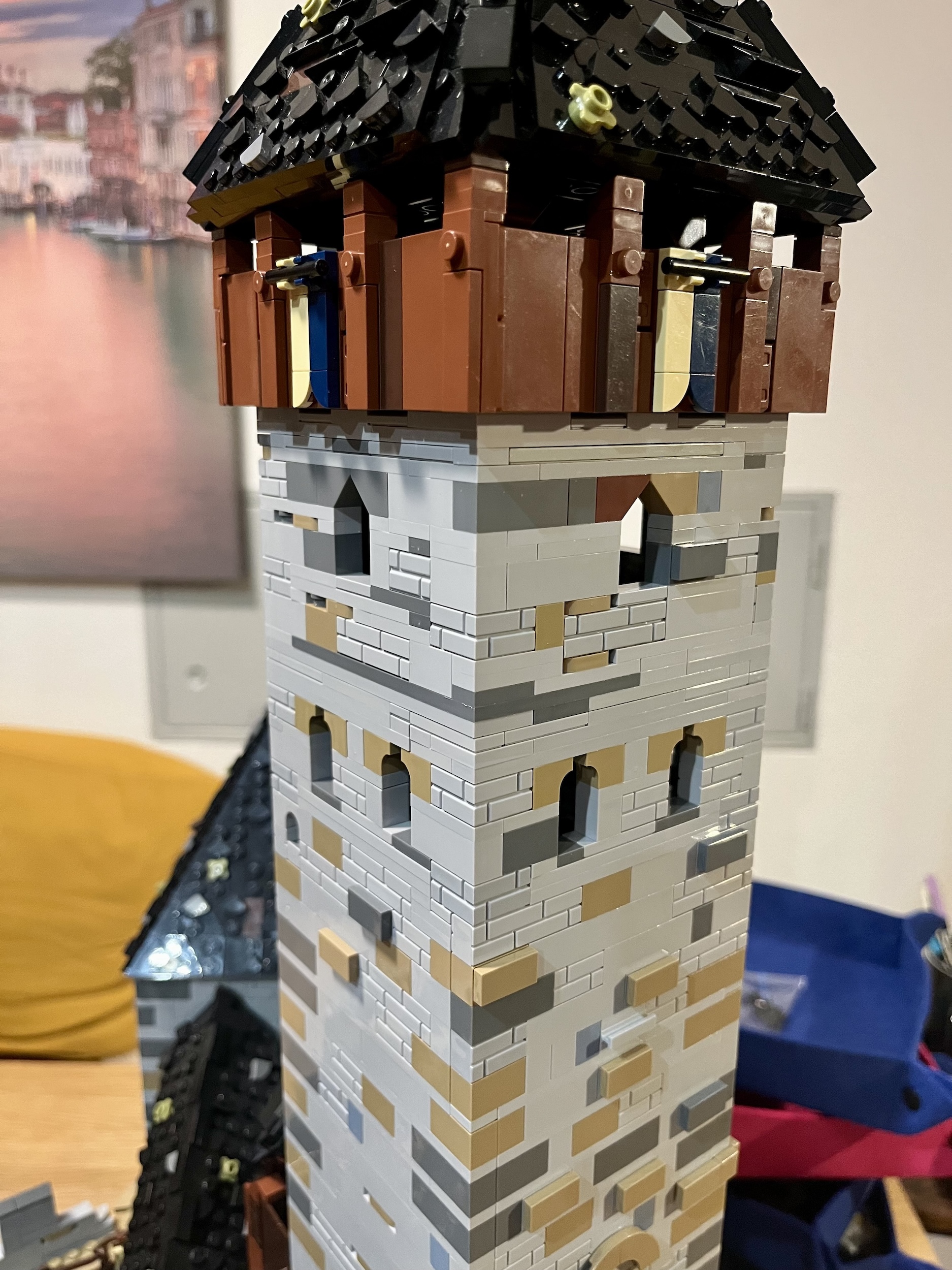 Zunächst musste natürlich die Entscheidung getroffen werden, wo dieses zusätzliche Stockwerk Einzug halten soll. Ich kam schnell zu dem Schluss, dass es am einfachsten ist, unter der Hurde, also dem Holzaufbau am Turm, ein zusätzliches Stockwerk einzuziehen. Mit jeweils einem zentralen Fenster auf jeder Seite, sodass es sich gut in die Optik des Turmes einfügt. Beim Bau bin ich dann darauf gekommen, dass ich mich um die herausnehmbare Seitenwand nicht kümmern muss. Es reicht vollkommen aus, ein abnehmbares, vollständiges Segment eines Stockwerks zu bauen.