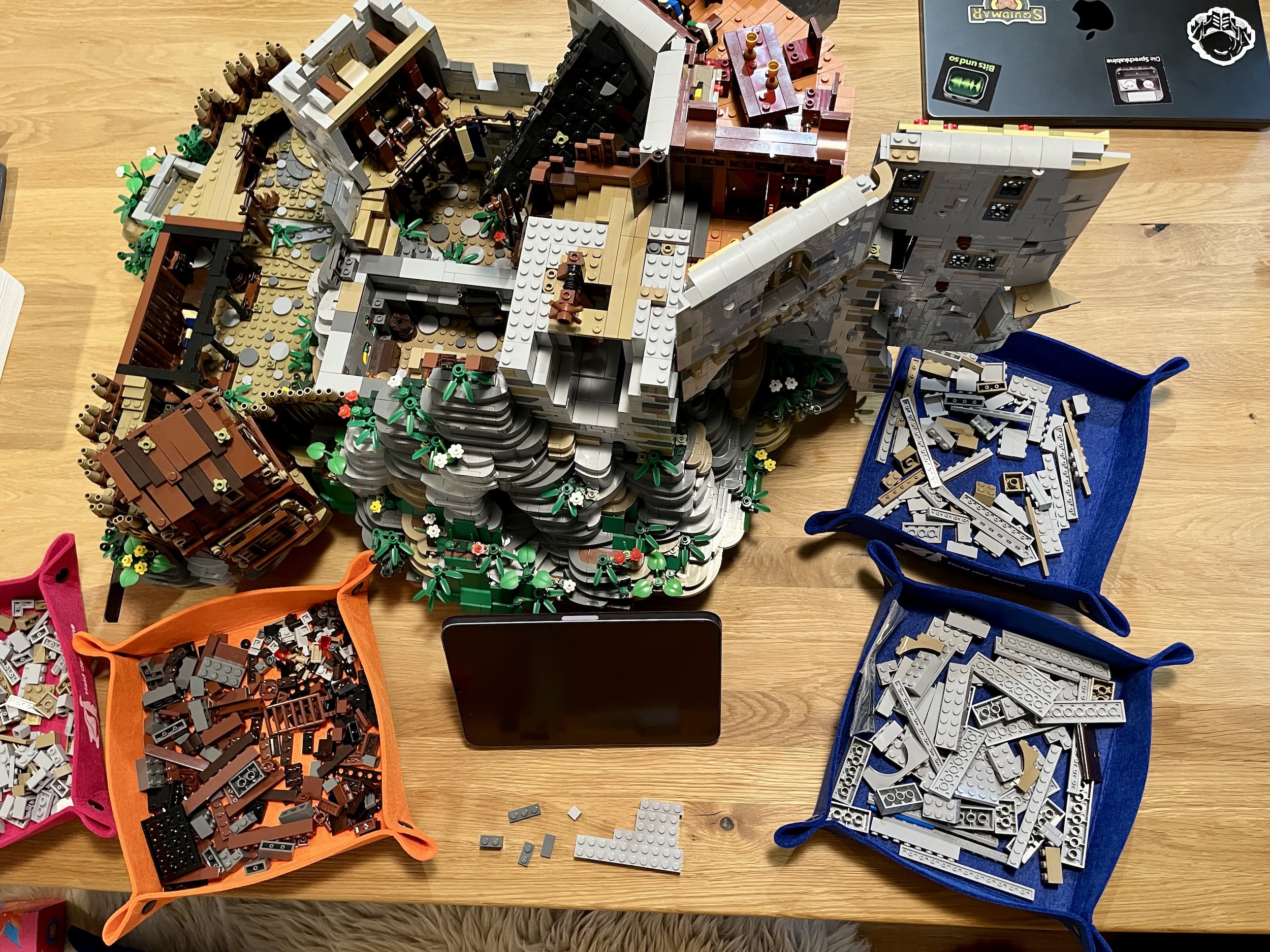 Doch eines hat mich seit der Saalbauerweiterung und dem Anbau der Hurde immer etwas gestört. Vor allem seit ich den mittelalterlichen Wohnturm daneben stehen habe (Mittelalterlicher Wohnturm). Der Bergfried wirkt etwas niedrig und klein. Deshalb wollte ich, bevor die nächste große Erweiterung ansteht, ein Stockwerk einziehen, um diesen wieder in voller Pracht über alles ragen zu lassen. Also habe ich die Burg so weit es geht auseinandergenommen und in der Küche auf dem Esstisch platziert. Da habe ich ausreichend Platz, um mich um dieses Bauvorhaben zu kümmern.