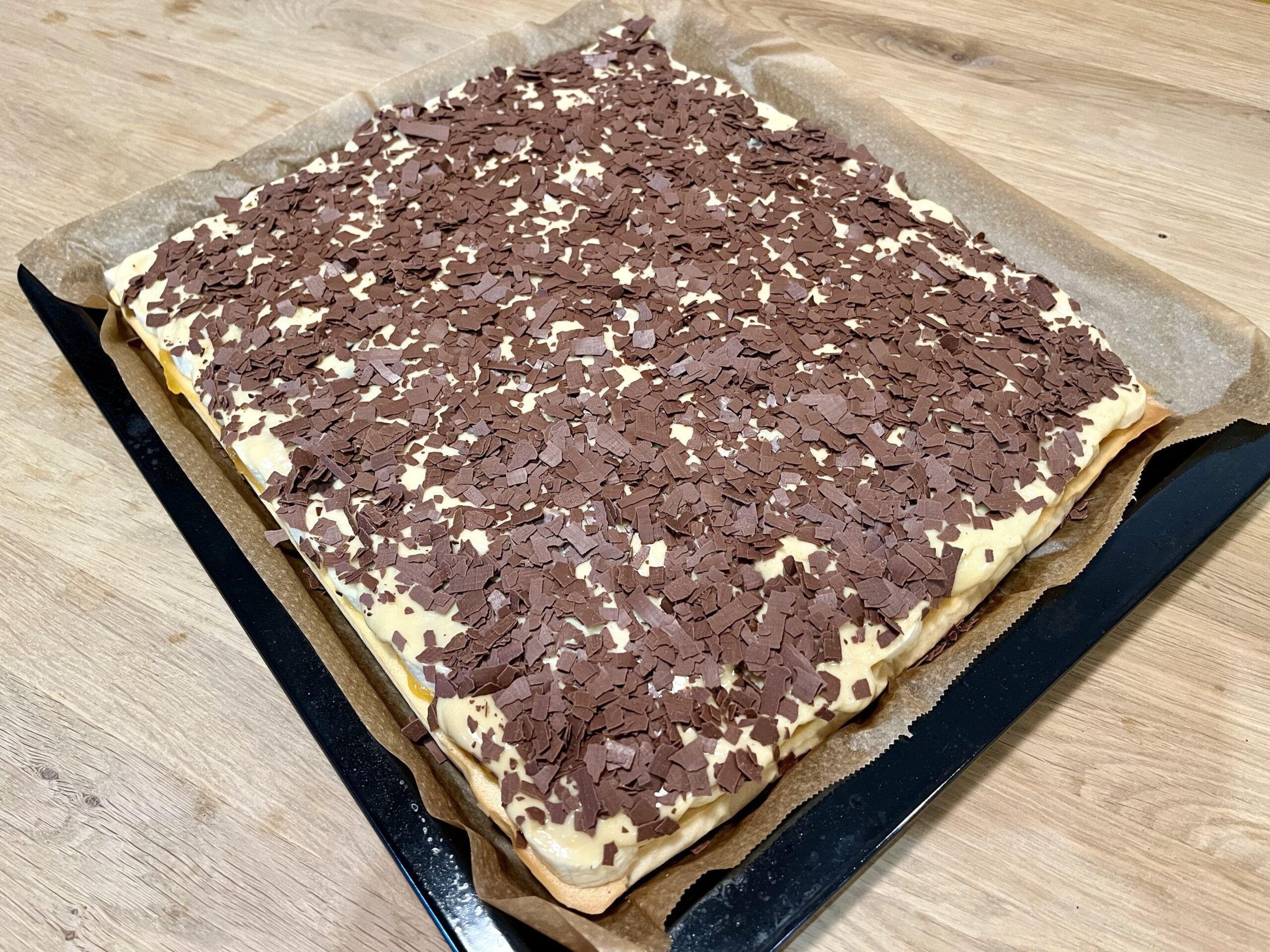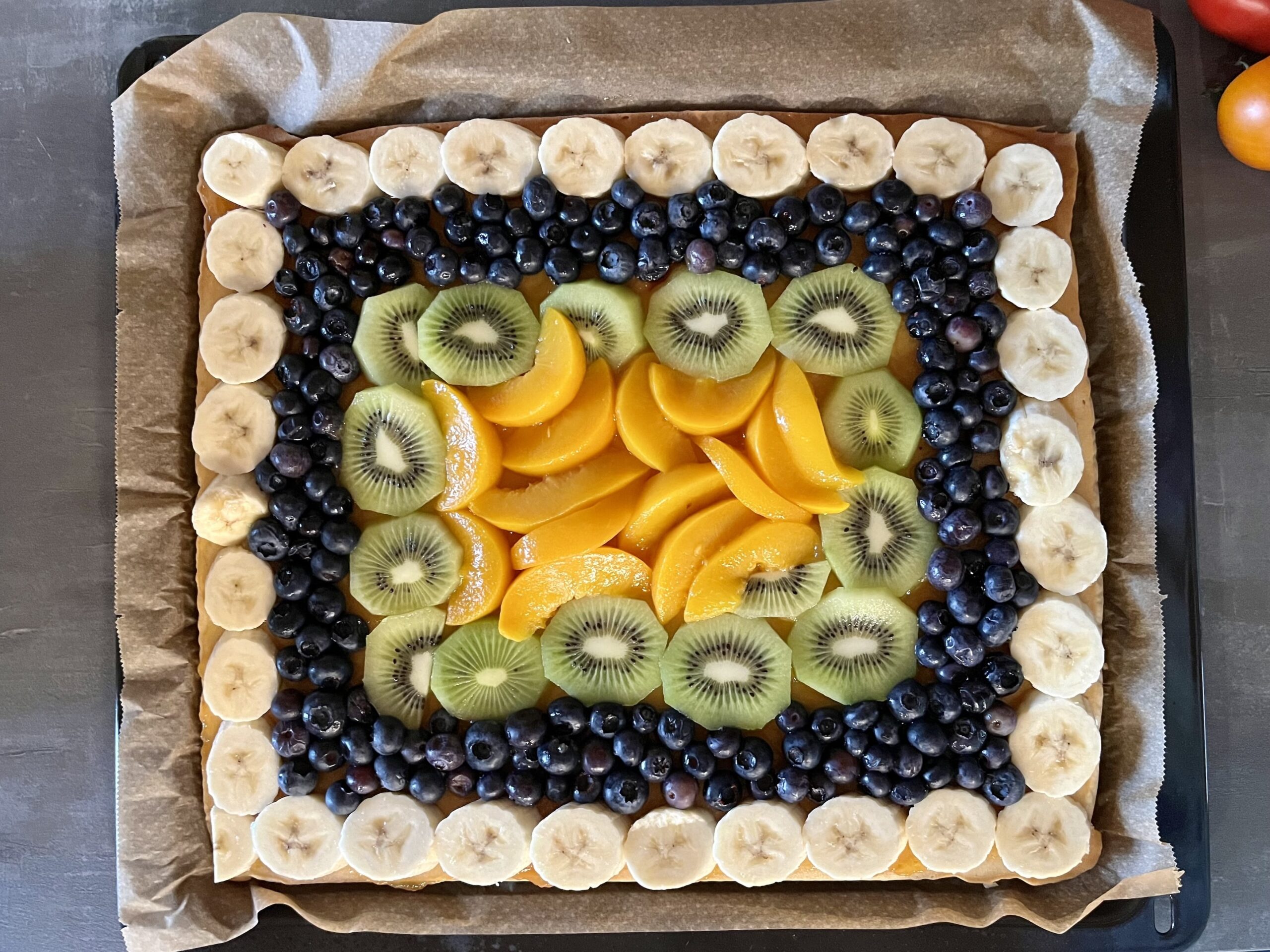 Jedenfalls habe ich mich für dieses Jahr entschieden, einen Obstkuchen zu machen – Fotos gibt es weiter unten. Zunächst wollte ich ihn klassisch zubereiten. Sprich, in einer entsprechenden Form, die am Rand etwas höher und schön rund ist. Doch das schien mir etwas arg wenig, deshalb wurde es dann doch ein ganzes Blech. Als Teig dient eine leichte Sandmasse. Das Rezept ist aus einem Kochbuch der Eltern, das zwei Jahre älter ist als ich – also 37 Jahre. Darauf dann etwas selbstgemachte Pfirsichmarmelade als Puffer, zwischen Teig und Obst. Auf das unterschiedliche Obst kam schließlich noch ein Pudding-Belag.