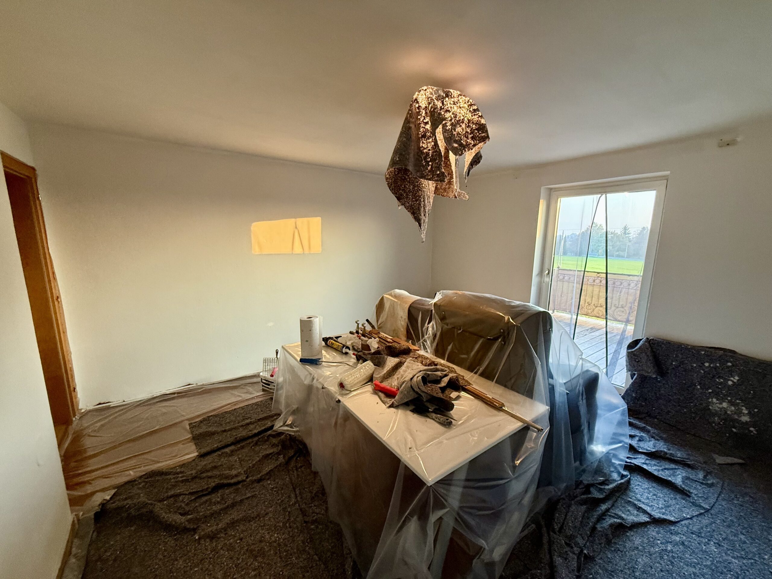 Doch bevor das Büro bezogen werden konnte, standen so einige Arbeiten an. Da ich am Feiertag, dem 1. November, nicht ausmalen wollte, begannen die vorbereitenden Arbeiten am Dienstag. Löcher wurden gestopft, improvisierte Regale entfernt, der Boden mit Plastik ausgelegt, Vorhangstangen demontiert. Zuerst wollte natürlich ausgemalt werden. Zwar waren die Wände alles andere als fleckig, aber einmal drüber malen und die frisch gestopften Löcher überpinseln hilft bei einem frischen Gefühl im Raum. Ausgemalt wurde natürlich in einem neutralen weiß, denn Farbe kommt durch Deko und Bilder rein. Anschließend eine Wand mit neuen Bodenleisten versehen, ordentlich durchwischen und die bereits vorhandenen Möbel konnten aufgestellt werden.