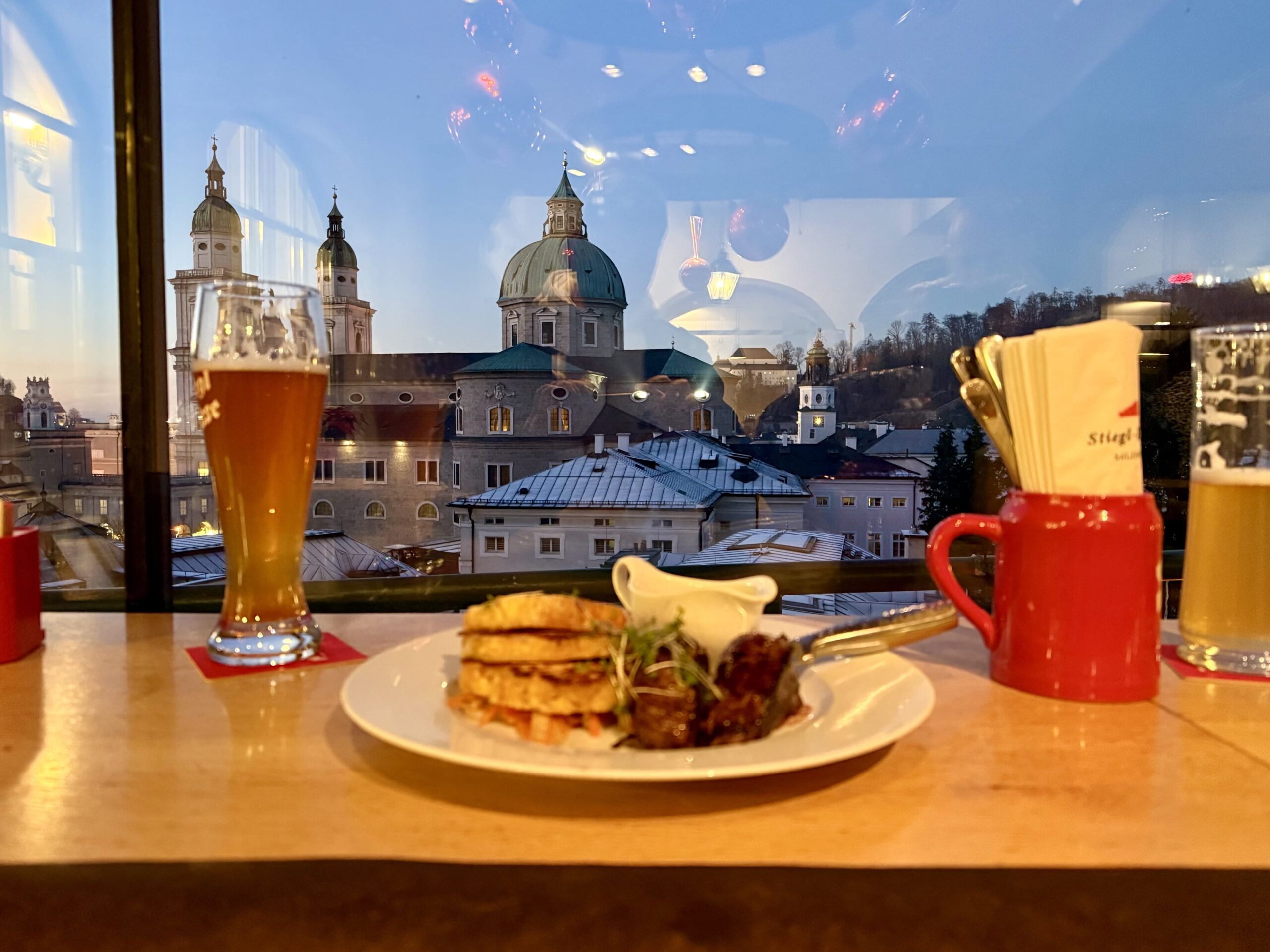 Allerdings war es ein herrlich sonniger Tag. So wie es die vergangenen Tage über stets der Fall war. Da muss man natürlich raus und wer kann es den anderen Menschen schon übel nehmen, dass sie einen solchen Tag in der schönsten Stadt verbringen wollen. Der Dom wurde herrlich angeleuchtet und von der Seite des Mönchsbergs bot sich ein wunderbarer Blick über Salzburg. Eingekehrt sind wir dann auch gleich beim Stieglkeller. War der dortige, kleine Wintergarten früher noch ein Geheimtipp, so ist er es nun scheinbar nicht mehr. Den letzten Platz, etwas abseits, hatten wir noch ergattert und verbrachten dort einen netten Nachmittag.