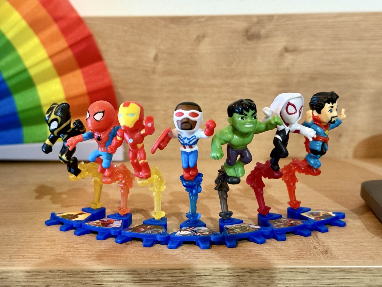 Glücklicherweise habe ich mich entschieden, immer gleich mehrere von den Packungen mitzunehmen, denn bereits zwei Wochen später gab es diese schon nicht mehr. Mir war nicht klar, dass diese eine so kurze Lebenszeit haben. Leider fehlt mir trotzdem eine Figur, nämlich Ant-Man. Zumindest kann bei sieben, die ich habe, Captain America schön in der Mitte platziert werden. Ein wahrer Anführer eben. Vielleicht bestelle ich mir die fehlende Figur einmal nach, wobei das cheaten wäre. Manchmal hat man eben Glück und manchmal nicht. Und besonders bei solchen Dingen wie Überraschungseiern ist es doch das witzige, sich überraschen zu lassen. Das Konzept steckt im Namen.