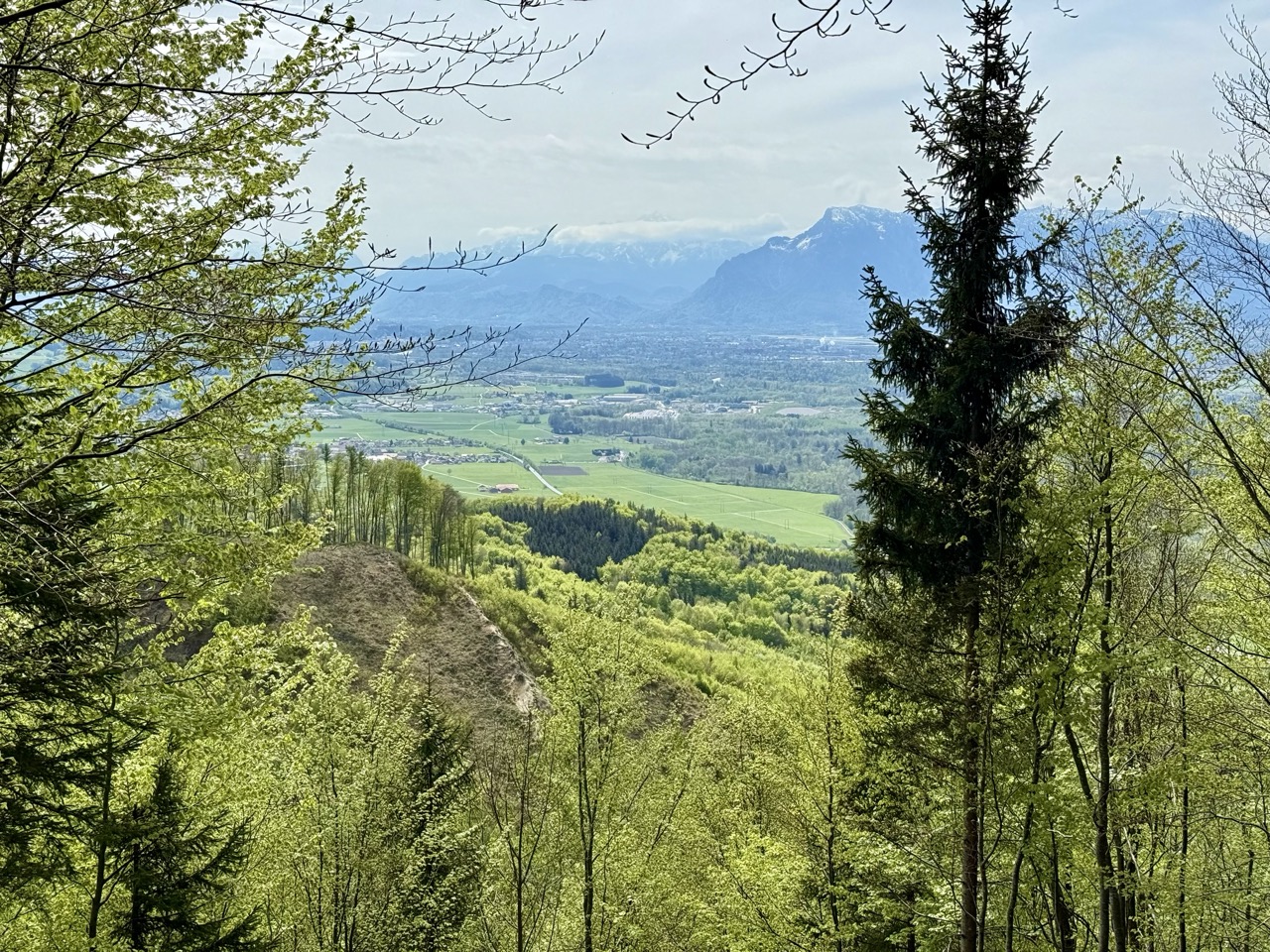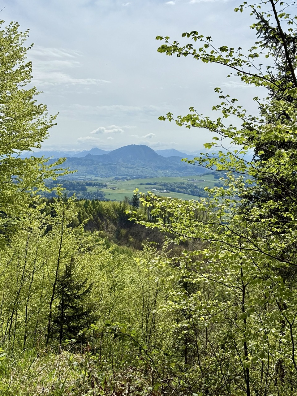 Es ist ein herrlicher Rundweg, für den man gut eineinhalb Stunden braucht, wenn man sich Zeit lässt. Er bietet immer wieder schöne Ausblicke. Immer wieder sieht man durch Schneisen im Wald rund um den Berg herum auf das Tal hinab. Auf der einen Seite sieht man die majestätischen Berge. Sie kommen wunderbar zur Geltung. Auf der anderen scheint die Landschaft nie enden zu wollen. Wir waren gerade zur Mittagszeit unterwegs, wenn die meisten Leute irgendwo eingekehrt sind, um zu essen. Dadurch war es vergleichsweise ruhig. Als wir wieder zurück am Parkplatz ankamen, war dieser prall gefüllt.