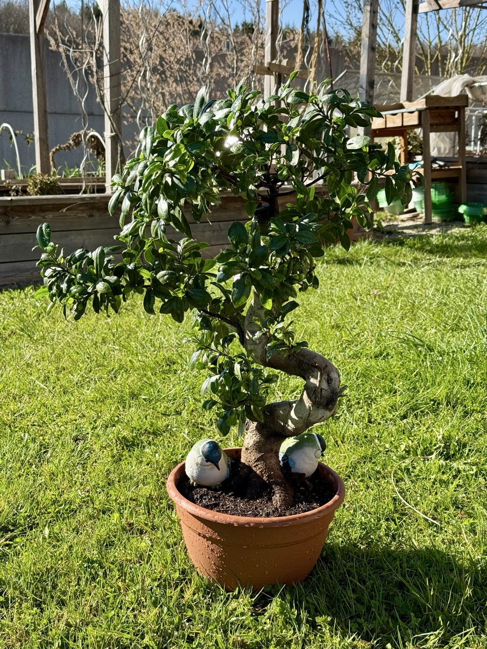 Vor einigen Jahren habe ich mir bei einer Hofer-Filiale, ich glaube, es war in Bergheim, einen Bonsai mitgenommen. Das Bäumchen hat mich sofort angesprochen. Der Stamm hatte eine verdrehte, spiralartige Form; die Blätter waren saftig dunkelgrün. Er stand lange Zeit am Fenster in meinem Wohnzimmer. Wirklich gewachsen ist er allerdings an dieser Stelle nicht. Ich dachte schon, der Bonsai geht ein und wird kaputt. Es wurde ein erster Rettungsversuch unternommen, indem der Bonsai in die Wohnung der Eltern kam. Die haben einen großen Wintergarten, wo er einen perfekten Platz in der Sonne erhielt. Seither wächst der Bonsai, als gäbe es keinen Morgen. Scheinbar war der Platz beim Wohnzimmerfenster nicht so ideal.