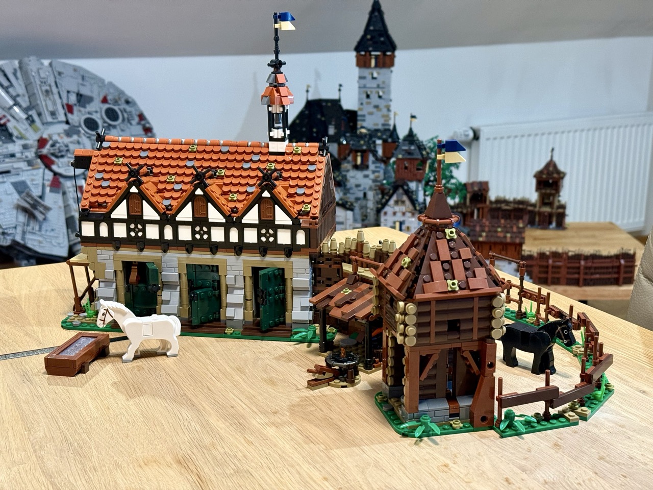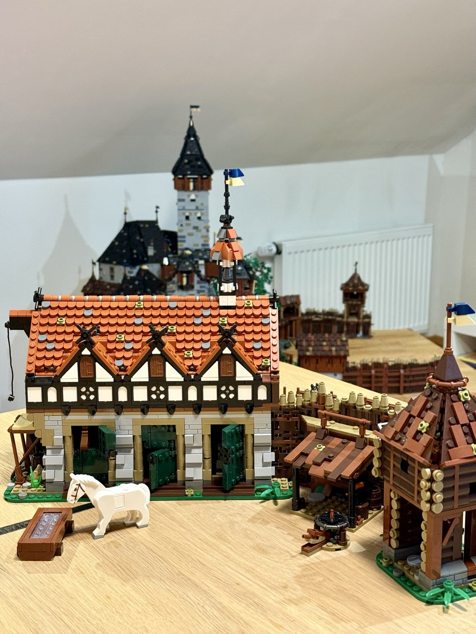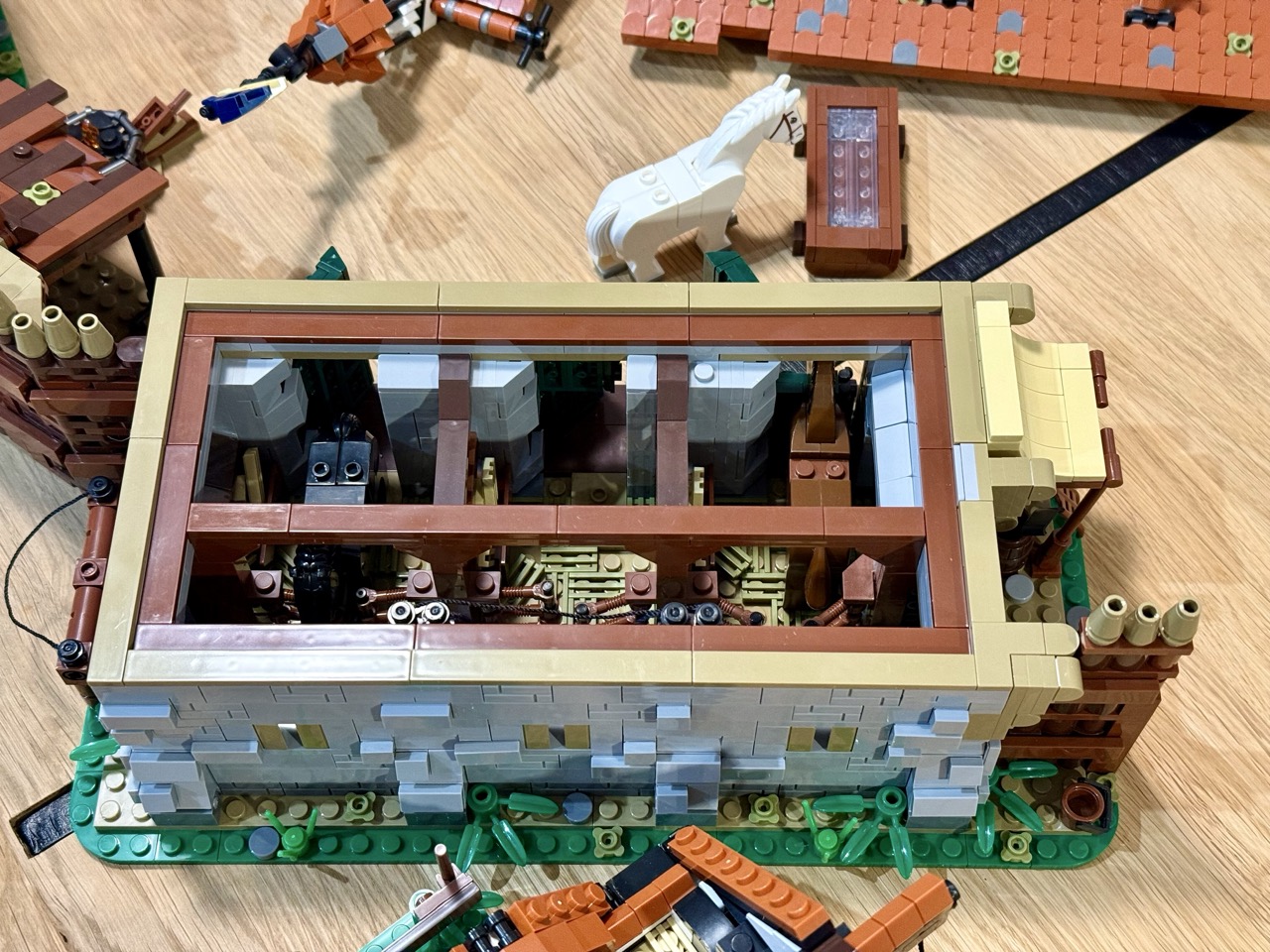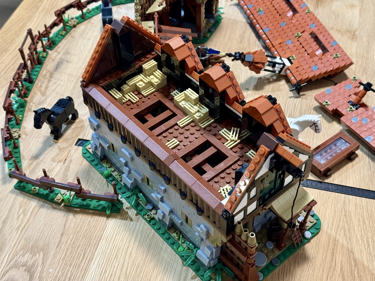 Mit über 3.000 Teilen sind die Stallungen durchaus umfangreich, doch es handelt sich dabei um viele kleine Teile. Das Dach allein besteht aus über 350 Dachziegeln, die verbaut und ausgerichtet werden wollen. Keine amüsante Arbeit, allerdings eine, die sich lohnt. Denn das Ergebnis sieht wirklich toll aus. Die Wände sind gewohnt massiv gebaut. Es kommen erneut interessante Bautechniken zur Anwendung, die den Bau kurzweilig machen. Ich bin sehr zufrieden mit den Stallungen. Man entdeckt während des Baus immer wieder schöne Details und Andeutungen, und sie machen sich toll in der Vorburg. Es gibt allerdings ein kleines Problem.