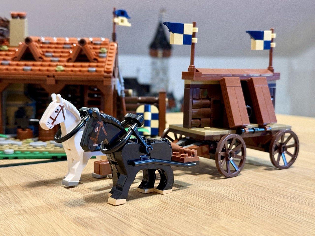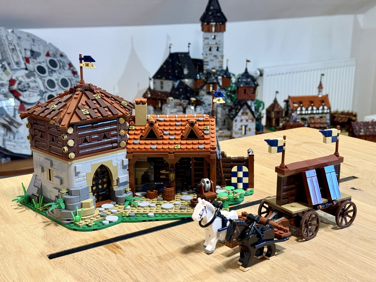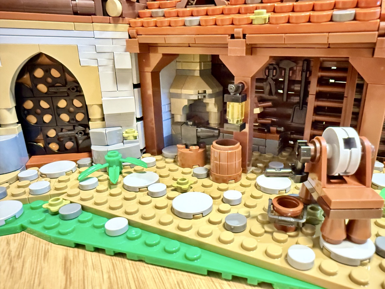 Das Set an sich ist hervorragend. Gewohnt detailliert und mit viel Liebe zum Detail gestaltet. Es sind viele Waffen und verschiedenste Schilde dabei, wie es sich für einen Rüstmeister gehört. Der Bau ist nicht allzu komplex und abwechslungsreich genug. Die knapp hundert Dachschindeln zu verlegen, war nach den über 350 von den Stallungen auch kein Problem mehr. Für mich verbindet das Gebäude des Rüstmeisters sowohl die alte Bauweise als auch die neue, angedeutet durch das modernere Dach. Mir gefällt er sehr gut. Ich mag es auch, wenn mal zweitausend Teile am Tisch liegen und man sich durch die Anleitung arbeitet.