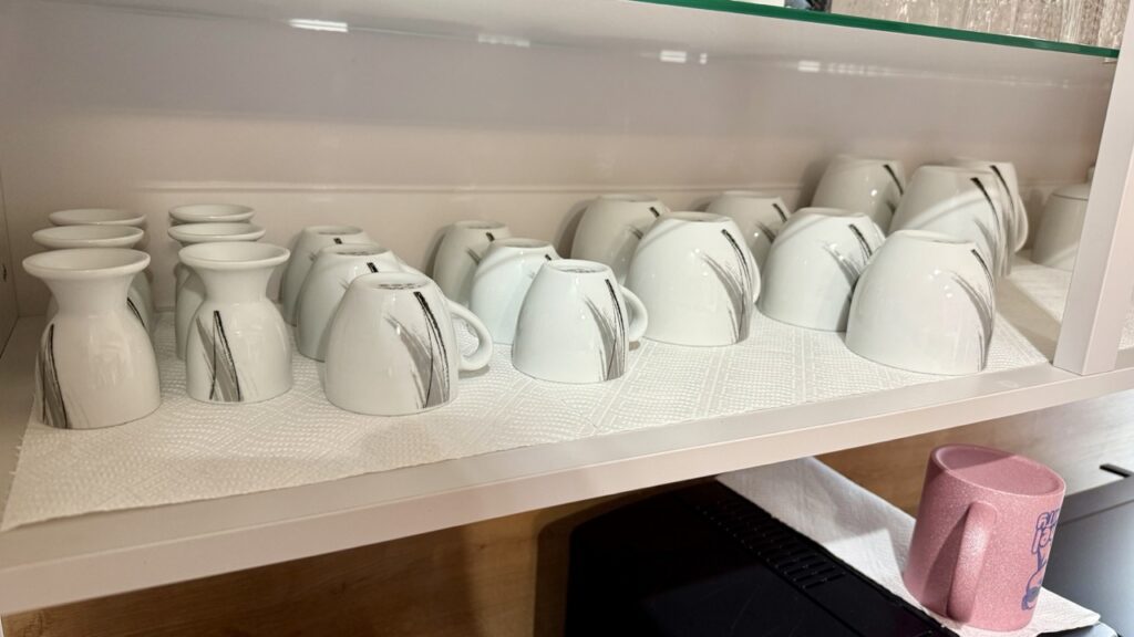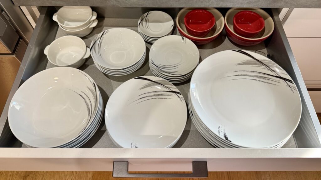 Das 62-teilige Set war mit allem ausgestattet, was das Herz begehrt. Große und kleine Teller, Suppenschüsseln, kleine Schüsseln, Eierbecher, Espresso- und mittlere Tassen (inklusive Untertassen), große Tassen, Zucker- und Milchbehältnisse – einfach alles, was man benötigen könnte. Sie haben ein schönes Design aus schlichtem weiß mit grau-schwarzen Akzenten. Für knapp 90 € konnte ich dazu einfach nicht nein sagen. Eingepackt, bezahlt, mitgenommen und durch Spüli den Geschirrspüler fleißig gewaschen, ging es nun zur nächsten Herausforderung: Das Ganze irgendwie passend einzuräumen.