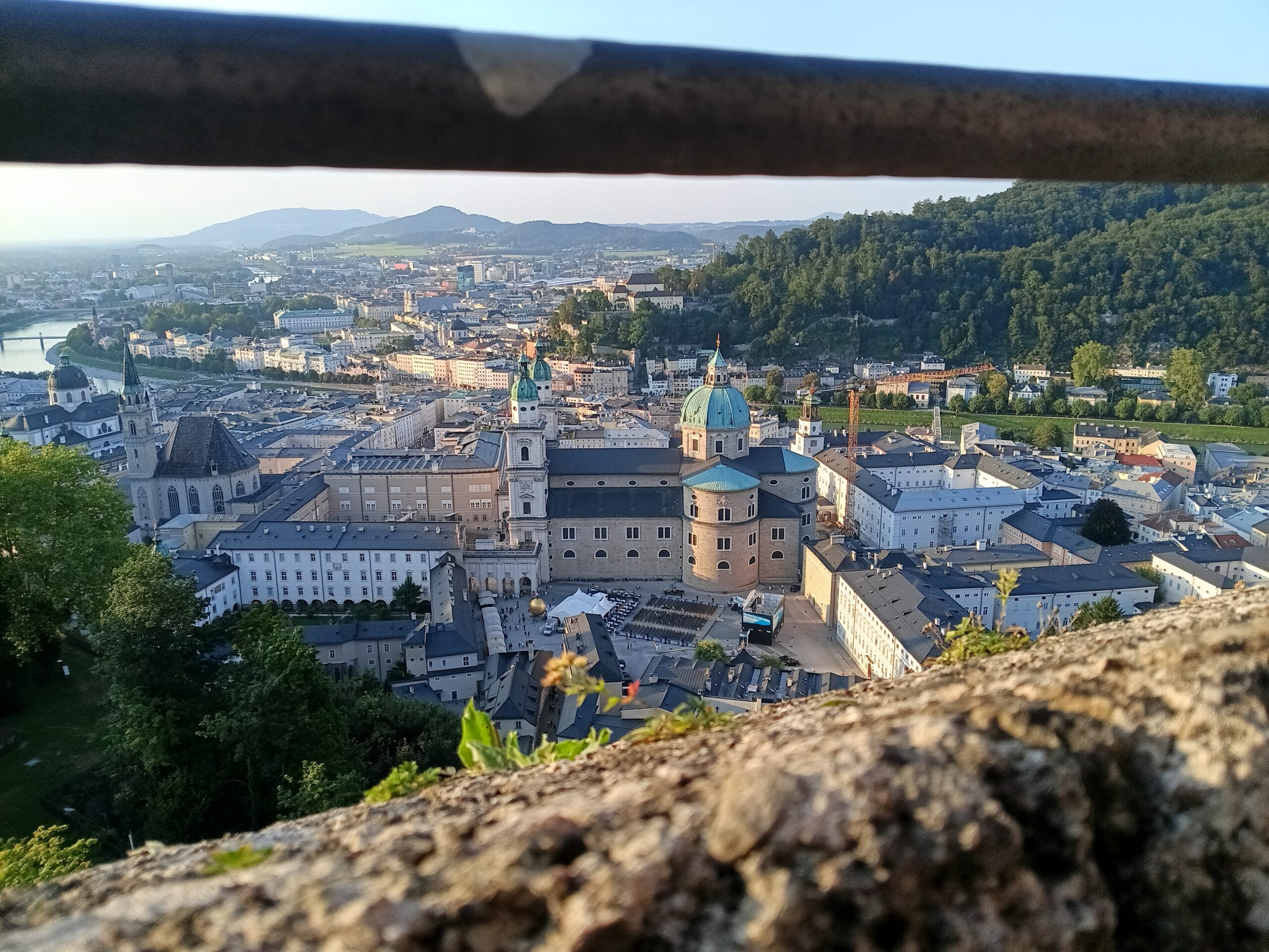 Der Ausblick von der Festung ist immer wieder beeindruckend und ein kleiner Spaziergang rund um die Anlage musste sein, bevor wir uns einen Platz suchten. Als wir zurückkamen, waren die besten Plätze natürlich schon belegt. Zuerst war die Überlegung, sich ganz hinten hinzusetzen. Die Sicht war nicht gerade ideal, trotz des leicht abfallenden Geländes. Da machte eine Bank leicht abseits auf sich aufmerksam. Niemand hatte sich bisher dort niedergelassen. Wir hatten unsere Tickets und es hieß „freie Platzwahl“. Es sprach nichts dagegen, sich also dort hinzusetzen. Die bessere Sicht, leicht von der Seite, wurde allerdings mit der bescheidenen Sitzqualität des parkbankähnlichen Konstrukts bezahlt. Es war alles andere als gemütlich.