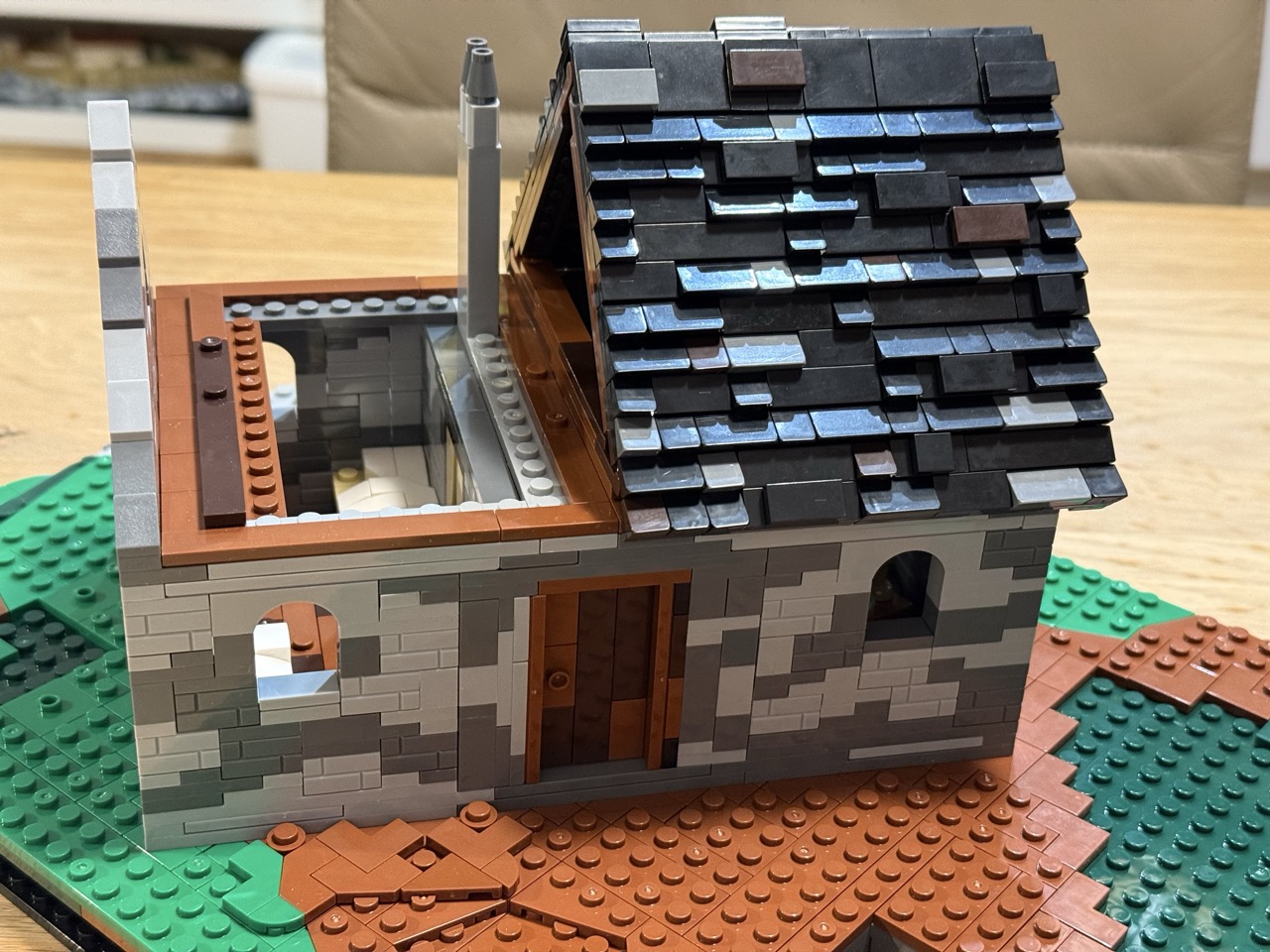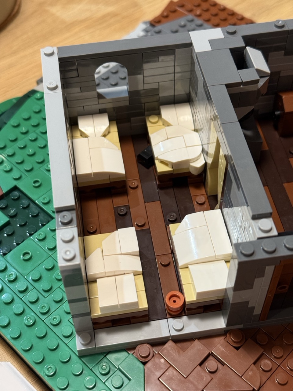 Tatsächlich ist der Bauspaß hier um einiges größer. Man beginnt mit dem Bau der Grundplatte, wie es bereits bei der Kapelle der Fall ist. Anschließend wird das Gebäude gebaut. Das ist insofern interessant, als das Gebäude schräg in die Umgebung eingefügt wird, was man nicht oft zu sehen bekommt. Klemmbausteine bestechen durch rechte Winkel und Ecken, da ist es schwierig, irgendwo andere Winkel unterzubringen. Aber es gelingt dem Team von BlueBrixx auf eine nachvollziehbare Art, die Einsiedelei entsprechend in die Umgebung einzubetten. Die Einsiedelei selbst besteht aus zwei Räumen: dem Essens- oder Aufenthaltsraum und einem Schlafsaal für die aktuell vier Mönche. Schließlich kommt noch das geteilte Dach drauf, welches erneut durch eine spannende Bauweise besticht. Wie es scheint, meint es BlueBrixx ernst damit, dass jedes Dach etwas anders gebaut wird.