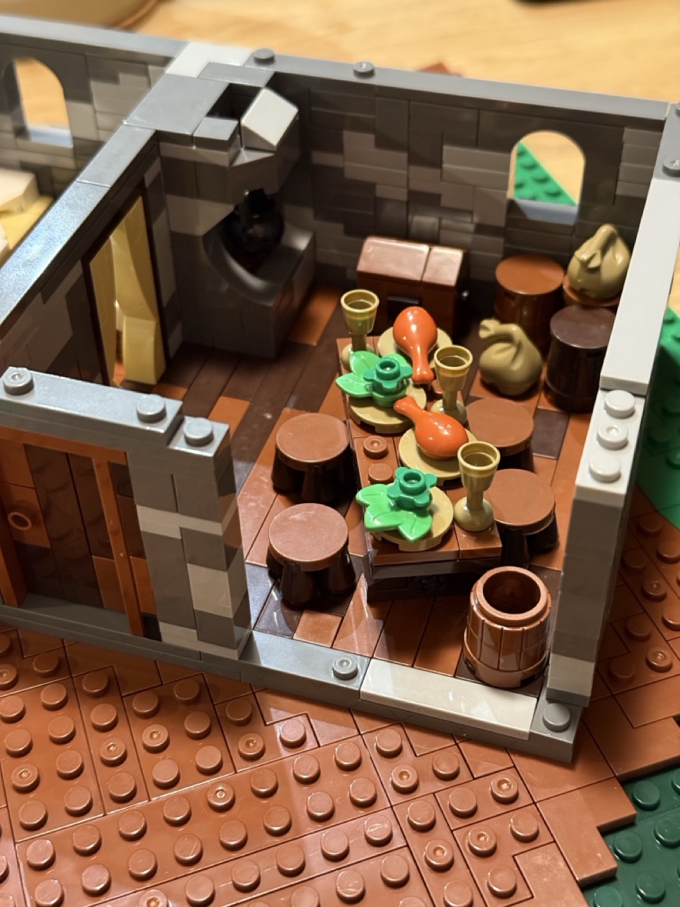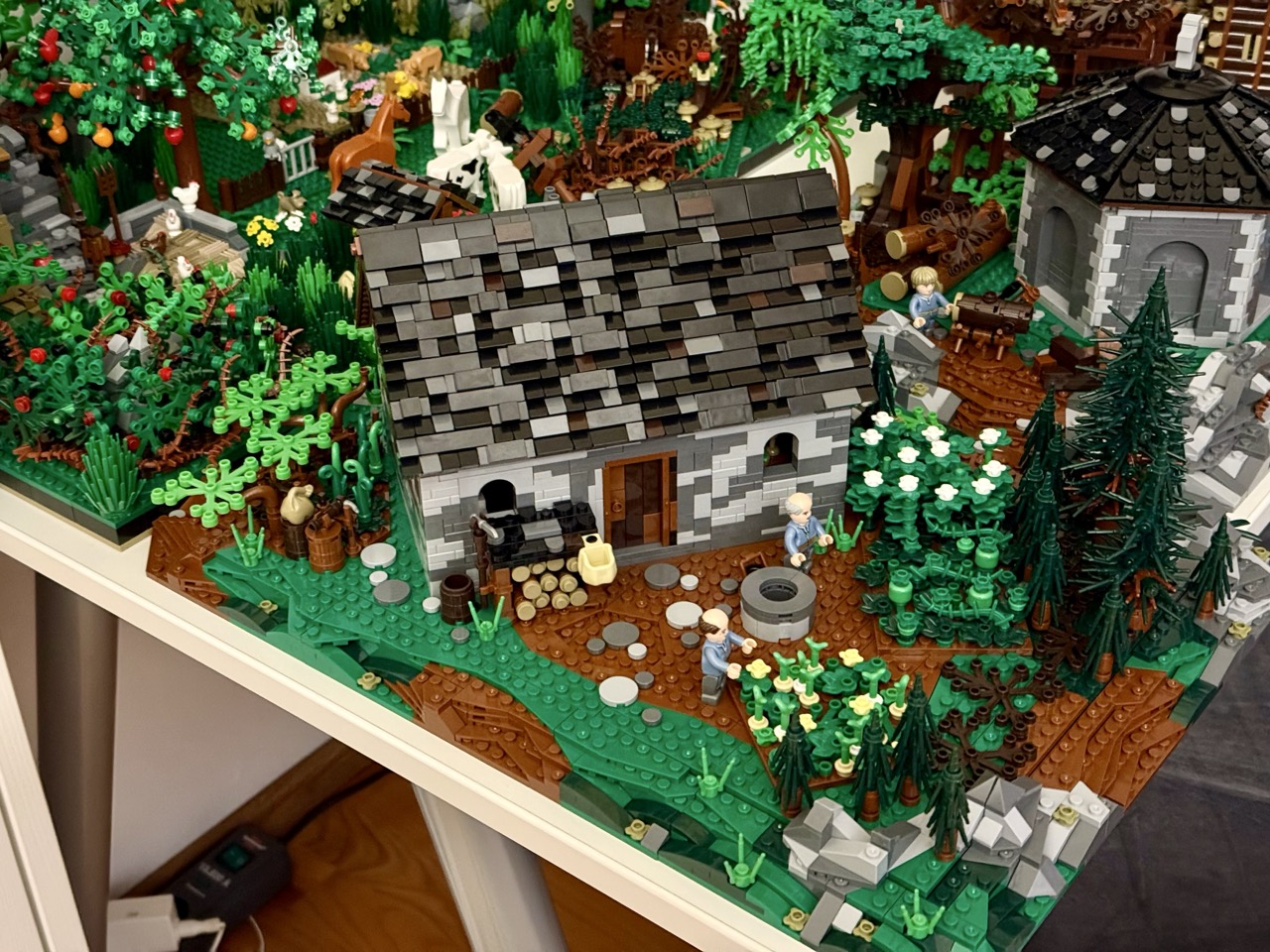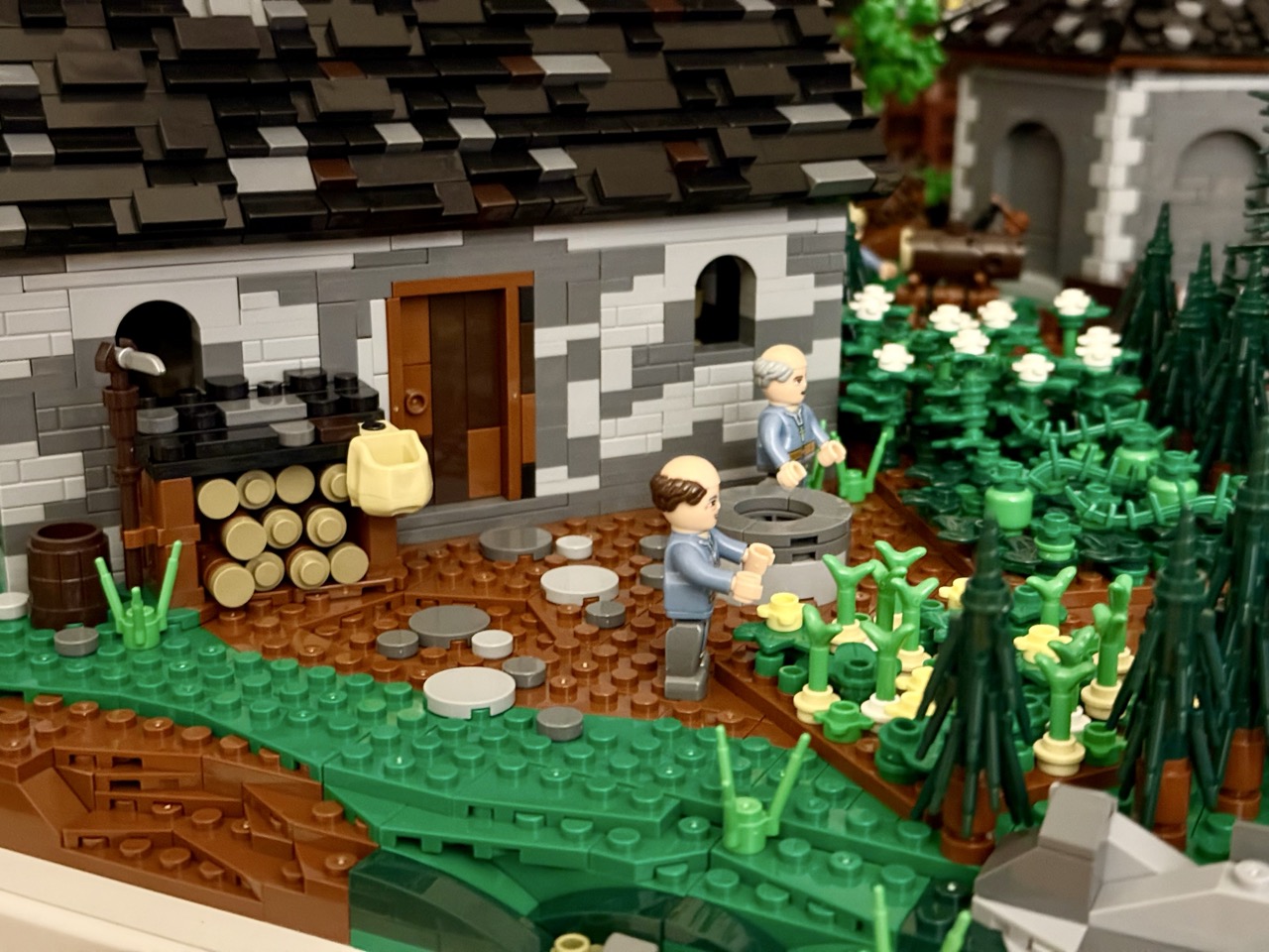 Als Letztes kümmert man sich um die Umgebung, die Verzierungen, Bäume, Sträucher und einen kleinen Steinbruch beinhaltet. Die Bäume sind einzigartig in ihrer Konstruktion und habe ich so in noch keinem Set gesehen. Durch die dichte Flora wirkt es tatsächlich so, als hätten sich die Mönche irgendwo im Wald dazu entschlossen, dass hier ein Kloster entstehen soll. Irgendwann kommen die Menschen schon nach und es wird sich ein kleines Dorf darum versammeln. Es passt hervorragend zur Kapelle. Zwar halte ich die beiden Gebäude noch getrennt und werde sie erst später, mit den kommenden Erweiterungen miteinander verbinden, aber schon jetzt sieht es großartig aus.