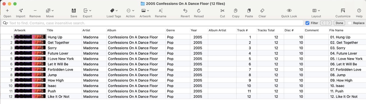 Nach ein wenig Suchen bin ich auf die Software »Tag Editor 2« gestoßen. Hier zieht man beispielsweise die m4a-Dateien rein und sie werden ordentlich in einer Tabelle dargestellt. Das macht es einfach, die Metadaten zu vergleichen. Ist überall derselbe Albumname eingetragen? Stimmt das Veröffentlichungsjahr? Ist der Name korrekt geschrieben (ich mag es beispielsweise nicht, wenn die Namen der Sänger*innen in reinen GROSSBUCHSTABEN geschrieben stehen; ich will nicht angeschrien werden, besonders nicht von Software)? Und ich kann in einer Software wie dem »Tag Editor 2« sicherstellen, dass das Albumcover eine maximale Größe von 500 × 500 Pixel aufweist und nicht größer als 1 MB ist. Das ist für manche Geräte wichtig und ich möchte, dass die „Rohdaten“ so kompatibel wie möglich sind.
